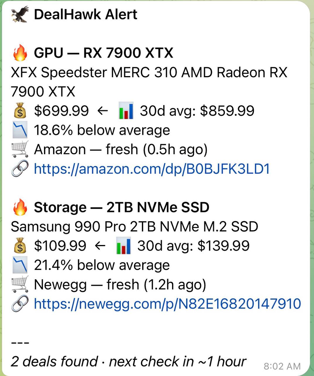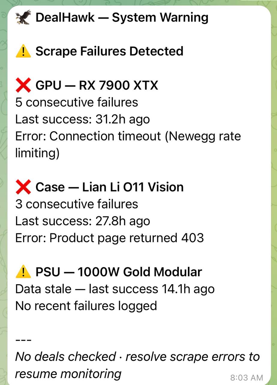 LiveBuilt a self-hosted Python automation app that scrapes pricing data, stores history in SQLite, runs scheduled jobs, and sends Telegram alerts when thresholds are hit. More important than the code: I debugged TLS blocks, scheduler restart issues, and database lock contention until it stayed reliable.
